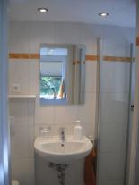 Bad mit wandhängendem WC, einem Waschtisch mit Spiegel, einer bodenbündiger Dusche, einer Handbrause und einer „Raindance“ Kopfbrause, sowie einer Duschkabine.