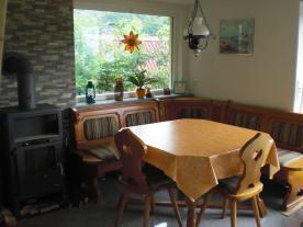 Im Wohn-Esszimmer kann man es sich auf dem Ecksofa oder auf der Eckbank gemütlich machen.