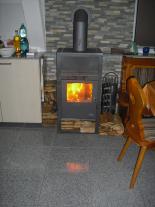 Die Beheizung erfolgt mittels einem Schwedenofen (Brennholz vor Ort) mit Panorama-Glasscheibe oder