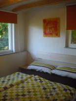 Der Schlafraum im Erdgeschoß verfügt über ein Doppelbett (1 Matratze 140x200), einen kleinen Schrank, Kleiderhaken sowie einen großen Spiegel und ist komplett mit Verdunklungsrollos ausgestattet.