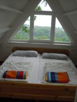 Im Dachgeschoß (Seeseite) befindet sich das 2. Schlafzimmer mit Doppelbett (2 Matratzen a‘ 90x200), mit Nachtkästchen, Sideboard und Kleiderhaken. Vom Giebel- und Dachfenster aus hat man einen herrlichen Blick auf den See und die Berge.
